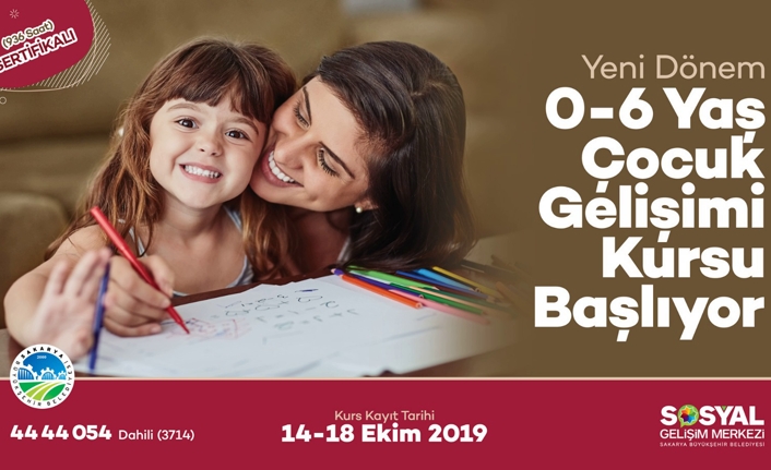 Sakarya Büyükşehir Belediyesi Sosyal Hizmetler Dairesi Başkanlığı tarafından düzenlenen 0-6 Yaş Çocuk Gelişimi Kurslarında yeni dönem başlıyor. 14 Ekim Pazartesi günü başlayacak yeni dönem kayıtları 18 Ekim Cuma günü sona erecek. 936 saatlik kursların ardından katılımcılara sertifika takdim edilecek. Vatandaşlar 44 44 054 (3714) numaralı telefon üzerinden ayrıntılı bilgiye ulaşabilecek.