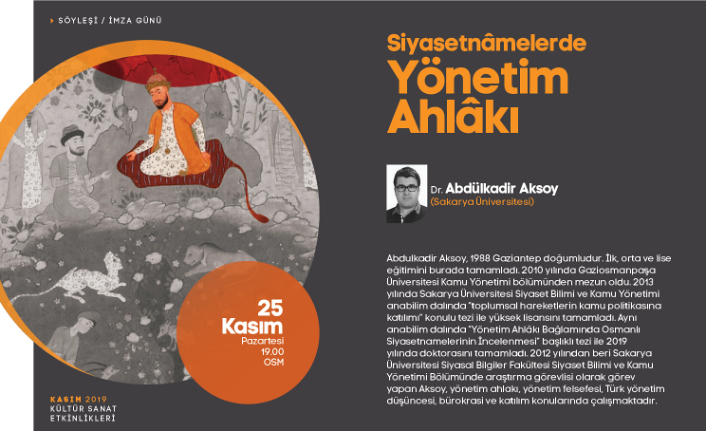 Sakarya Büyükşehir Belediyesi Kasım Kültür Sanat Etkinlikleri ‘Siyasetnamelerde Yönetim Ahlakı’ söyleşisi ve imza günü programı ile devam edecek. 25 Kasım Pazartesi günü Ofis Sanat Merkezi’nde gerçekleştirilecek etkinlikte Dr. Abdülkadir Aksoy kültür sanat dostları ile buluşacak. Kültür ve Sosyal İşler Dairesi Başkanlığı’ndan yapılan açıklamada, “Kasım Kültür Sanat Etkinlikleri ‘Siyasetnamelerde Yönetim Ahlakı’ başlıklı söyleşi ve imza günü etkinliği ile devam edecek. 25 Kasım Pazartesi günü OSM’de gerçekleştirilecek etkinliğe Dr. Abdülkadir Aksoy konuşmacı olarak katılacak. Tüm hemşerilerimiz söyleşi ve imza günü etkinliğine davetlidir” ifadelerine yer verildi. kocaali