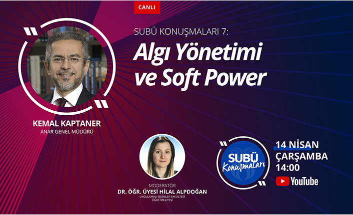 Sakarya Uygulamalı Bilimler Üniversitesi (SUBÜ) tarafından düzenlenen SUBÜ Konuşmaları’nın 7. konuşmacısı Ankara Sosyal Araştırmalar Merkezi (ANAR) Genel Müdürü Kemal Kaptaner olacak. ‘Algı Yönetimi ve Soft Power’ başlıklı söyleşinin moderatörlüğünü SUBÜ Uygulamalı Bilimler Fakültesi Öğretim Üyesi Dr. Hilal Alpdoğan gerçekleştirecek. Üniversitenin YouTube kanalı SUBÜ Haber’den canlı yayınlanacak söyleşide, ANAR’ın da yaptığı araştırmalar çerçevesinde iletişim kanalları ile sosyal medyanın artan gücü ve bu güçlerin bir kişi ya da topluluk üzerinde söz sahibi olma ve dilediğini yaptırma etkisi ele alınacak. SUBÜ Konuşmaları her Çarşamba saat 14.00’de herkese açık olarak gerçekleştiriliyor.