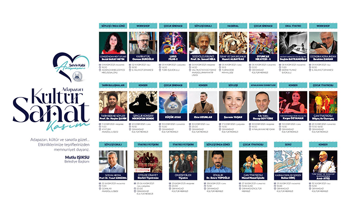Açıklanan takvime göre etkinlikler, 1 Kasım 2021 Pazartesi günü Yazar Betül Saray Metin’in “Günışığı’ndan Mektup Var” başlıklı söyleşi ve imza günüyle başlayacak. Kasım etkinliklerinde, Usta Fotoğraf Sanatçısı İbrahim Zaman, Karadeniz şarkılarının sevilen ismi Ekin Uzunlar, Oyuncu Anne olarak tanınan Şermin Yaşar, On Kişiydiler isimli oyunda sahne alan Ediz Hun, Gençlik ve Spor Bakanlığı Gençlik Hizmetleri Genel Müdürü Emre Topoğlu, Kilis Valisi Recep Soytürk ve Türk Sanat Müziği’nin ustalarından Amir Ateş gibi isimler Adapazarlılarla buluşacak. Aynı zamanda Devlet Tiyatroları iki farklı günde iki seansla Orhangazi Kültür Merkezi’nde sahne alacak.