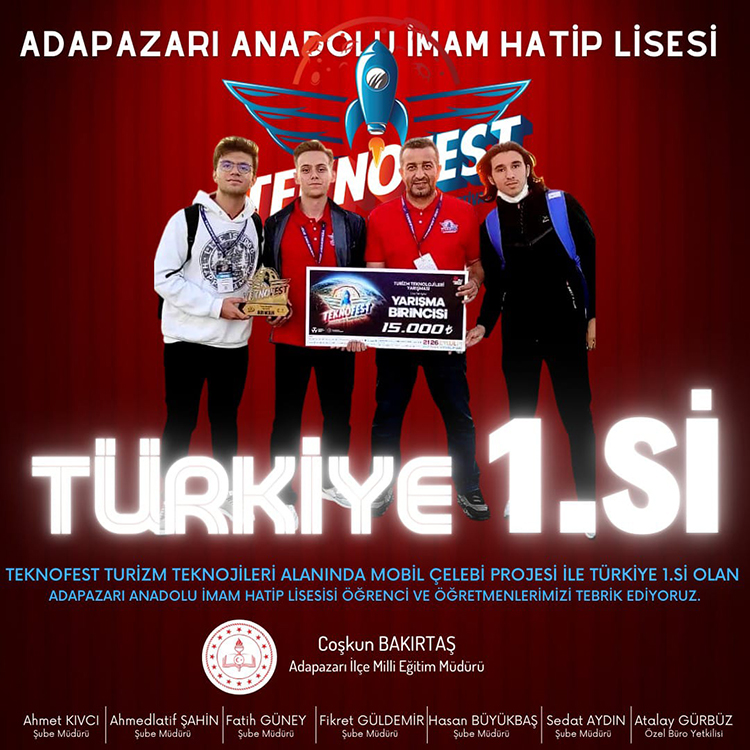 Adapazarı İlçe Millî Eğitim Müdürlüğü, 32 okuldan 271 öğrencinin hazırladığı 89 proje ile başvuru sürecini başarıyla tamamlayarak katıldığı “TEKNOFEST” etkinliğinde, Danışman Öğretmen Ayhan Yağız, takım üyeleri 11. sınıf öğrencileri İbrahim Sait Akarçeşme, Utku Altıntaş ve Faruk Öztürk’ ün, 57 bin kod ile tasarladığı, çift yönlü hizmete sahip, güvenlik seviyesi maksimum düzeyde ve kullanıma hazır olan sosyal medya platformu, Turizm Teknolojileri Yazılım Alanında “Mobil Çelebi Modern Seyahatname Projesi” ile TEKNOFEST Türkiye Birinciliğini kazanırken Danışman Öğretmen Sedat Coşar, takım üyeleri 12. sınıf öğrencileri Sıla Kayaalp, Ayşegül Biricik ve İlayda İnan’ ın, park direği, mobil uygulama ve sunucu yazılımı modüllerinin iletişim halinde bulunarak, bilgi işlem merkezinden park yerlerinin yönetilmesi ve anlık izlenmesi ile hayatı kolaylaştıran, Akıllı Ulaşım Teknolojileri Alanında “Akıllı Park Sistemi Projesi” ile TEKNOFEST Türkiye İkinciliğini kazanması ile haklı gurur yaşayan öğretmenlerin ve öğrencilerin mutluluğu fotoğraf karelerinde yerini aldı. Kıyasıya bir mücadeleden zaferle çıkan gençler Adapazarı ilçesine, okullarına ve ailelerine “Helal olsun!” dedirterek büyük bir sevinç yaşattı.