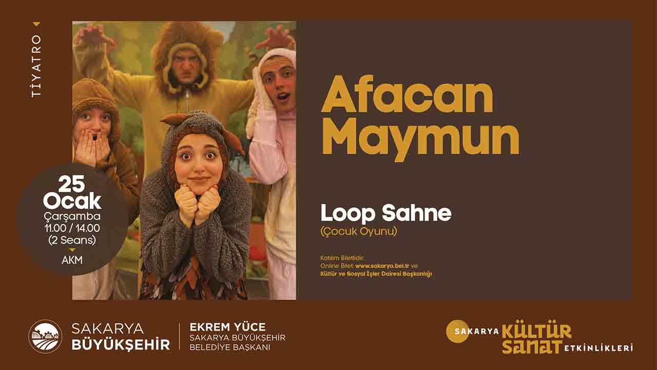 Sakarya Büyükşehir Belediyesi Ocak kültür sanat etkinlikleri tüm hızıyla devam ediyor. Bu kapsamda 25 Ocak Çarşamba günü saat 11.00 ve 14.00’da Loop Sahne tarafından sahnelenecek ‘Afacan Maymun’ isimli çocuk oyunu AKM’de minik izleyicilerle buluşacak. Kültür ve Sosyal İşler Dairesi Başkanlığından yapılan açıklamada, “Ara tatillerini keyifli değerlendirmeleri adına çocuk oyunlarını minik izleyicilerimizle buluşturuyoruz. Gösterimlerin biletli olduğu oyunlar için biletler www.sakarya.bel.tr adresinden veya Kültür ve Sosyal İşler Daire Başkanlığımızdan temin edilebilir” denildi.
