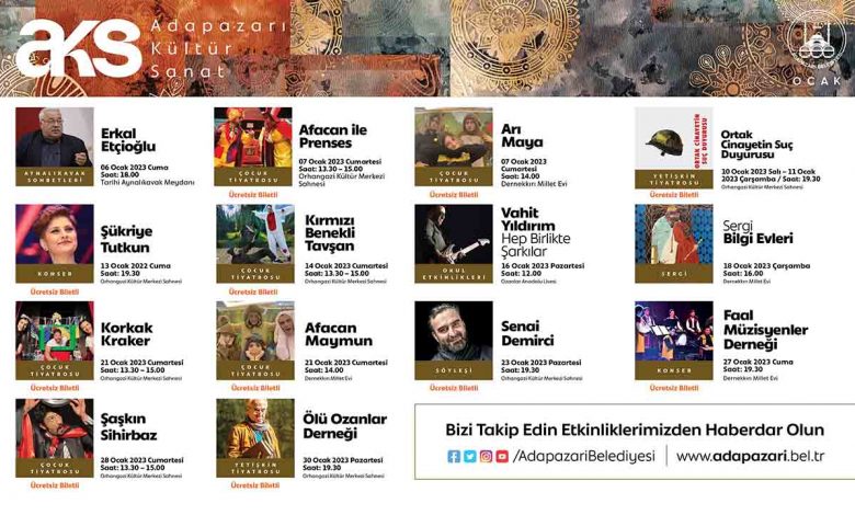 Adapazarı Belediyesi 2023 yılı Ocak ayı kültür sanat takvimi açıklandı. Ocak ayı etkinlikleri Adapazarı eski Belediye Başkanı Erkal Etçioğlu’nun konuk olacağı Aynalı Kavak Sohbetleri ile start alacak. Başkan Mutlu Işıksu, “Seçkin programlarımız, çocuk ve yetişkin tiyatrolarımız, konserler ve söyleşilerimizle yeni yılın ilk ayında da sizlerle buluşmaya hazırız. Kültür sanat dostlarımızı heyecanımıza ortak olmaya davet ediyoruz.” dedi.