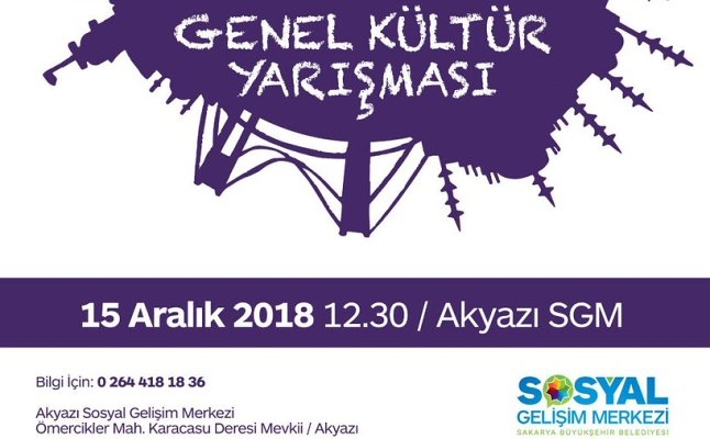Sakarya Büyükşehir Belediyesi Akyazı Sosyal Gelişim Merkezi Yerli Malı Haftası dolayısıyla genel kültür yarışmasına ev sahipliği yapacak. Akyazı SGM Çocuk Kulüpleri öğrencileri 15 Aralık Cumartesi günü saat 12.30’da başlayacak. Merkezden konuyla ilgili yapılan açıklamada, “Yerli malı haftası dolayısıyla ‘Ülkemi Tanıyorum Genel Kültür Yarışması’na tüm minikler davetlidir” denildi.kocaali