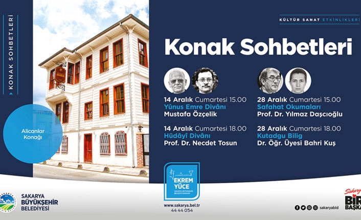 Kültür ve Sosyal İşler Dairesi Başkanlığı’ndan yapılan açıklamada, “Aralık Kültür Sanat Etkinlikleri kapsamında ‘Konak Sohbetleri’ başlıyor. Tarihi Alicanlar Konağı’nda 14 Aralık Cumartesi günü başlayacak ilk etkinlikte Mustafa Özçelik ‘Yunus Emre Divanı’ Prof. Dr. Necdet Tosun ise ‘Hüdayi Divanı’ sohbeti gerçekleştirecek. 28 Aralık Cumartesi günü etkinliklerinde Prof. Dr. Yılmaz Daşcıoğlu ‘Safahat Okumaları’  Dr. Öğr. Üyesi Bahri Kuş ise ‘Kutadgu Bilig’ sohbeti gerçekleştirecek. Tüm kültür sanat dostlarını konak sohbetlerimize davet ederiz” denildi.
