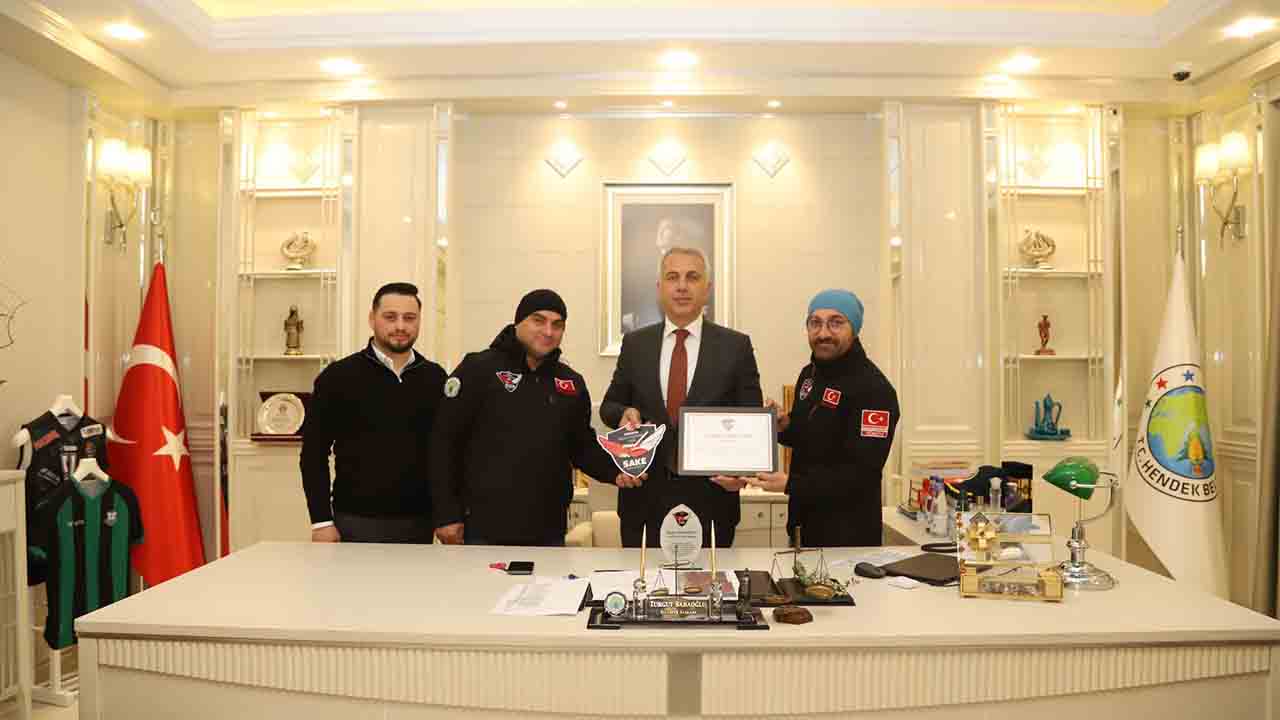 Sakarya Arama Kurtarma Ekibi (SAKE) gönüllüleri Hendek Belediye Başkanı Turgut Babaoğlu’nu makamında ziyaret ederek Arama Kurtarma faaliyetlerine göstermiş olduğu destek ve katkılardan ötürü onursal üyelik verdiklerini açıklayarak teşekkür plaketi takdim ettiler.