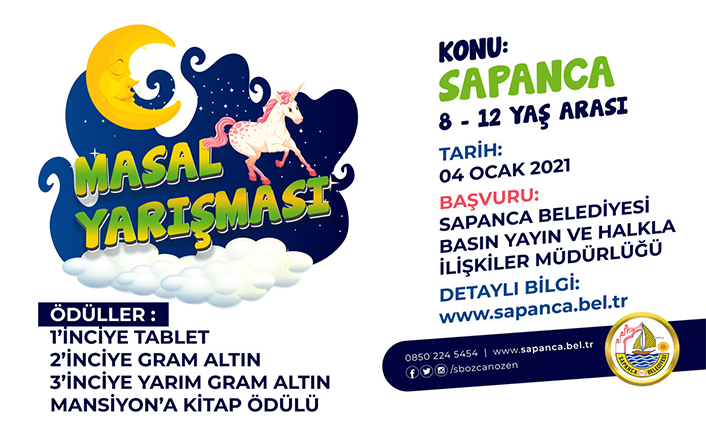 Sapanca Belediyesi yetkilileri yarışma ile ilgili bilgi verdi: “Yarışmaya Sapanca ilçesindeki 8-12 yaş arasındaki çocuklar katılabilir. Masalın içeriği “Sapanca” temalı olacaktır. Yazılar 2 adet A4 kâğıdını geçmeyecek. Kâğıdın bir arka yüzüne künye bilgileri (Adı-Soyadı, Okul, Sınıf ve Yaş ve İletişim Bilgileri) başvuru esnasındaki verilecek olan katılım formu eklenmelidir. Bilgileri eksik ya da hatalı olanlar değerlendirmeye alınmayacaktır. Her bir yarışmacı sadece bir masalla yarışmaya katılabilir. Masallar 04 Ocak 2021 Pazartesi tarihine kadar uzatılmış olup masallar Sapanca Belediyesi Basın Yayın ve Halkla İlişkiler Müdürlüğüne teslim edilecektir.