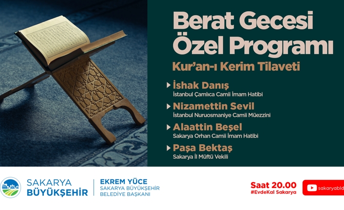 Sakarya Büyükşehir Belediyesi Berat Kandili dolayısıyla resmi Youtube hesabı SakaryaBLD üzerinden bir program düzenleyecek. Kur’an-ı Kerim tilavetinin gerçekleştirileceği programda kaside ve ilahiler okunacak, dualar edilecek. Konuyla ilgili yapılan açıklamada şu ifadeler kullanıldı: “Kovid-19 salgını dolayısıyla camilerimizde toplu olarak yapılan ibadetlere ara verilmişti. Berat Kandili’nde de camilerimizde toplu olarak bulunulmayacak. Büyükşehir Belediyesi olarak bu gecenin manevi iklimini evlere taşıyacağız. İstanbul Çamlıca Camii İmam Hatibi İshak Danış, İstanbul Nuruosmaniye Camii Müezzini Nizamettin Sevil ve Sakarya Orhan Camii İmam Hatibi Alaattin Beşel Kur’an-ı Kerim tilaveti ile kaside ve ilahilerle bu özel gecede gönüllere dokunacak. Sakarya İl Müftü Vekili Paşa Bektaş ise dualar okuyacak. Tüm vatandaşlarımızı resmi Youtube hesabımızdan yayınlanacak Berat Gecesi Özel Programını izlemeye davet ediyoruz” denildi.