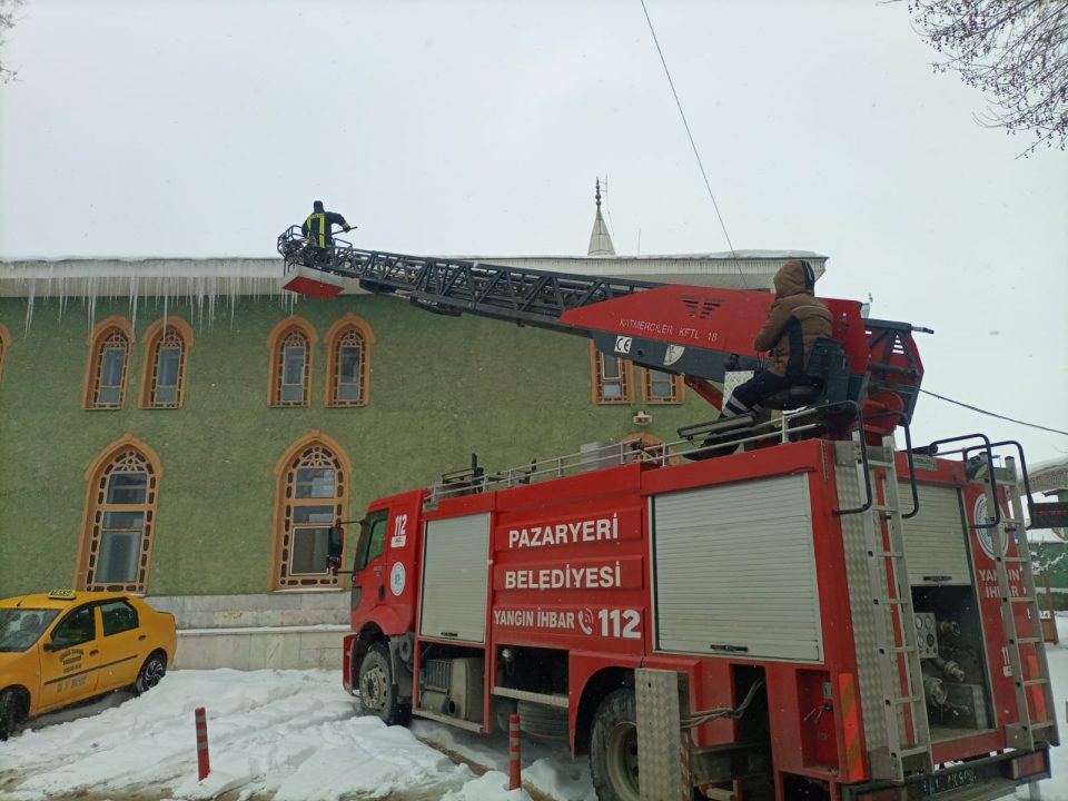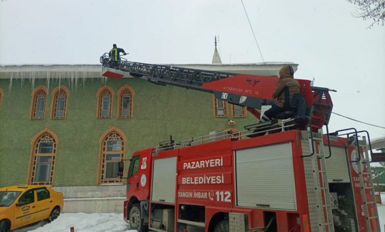 Bilecik’in Pazaryeri Belediyesi itfaiye ekipleri, çatılarda oluşan buz sarkıtı ve biriken kar kütlelerini temizliyor.