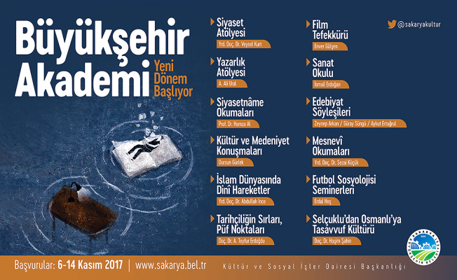 Sakarya Büyükşehir Belediyesi tarafından 2010 yılından bu yana düzenlenen Büyükşehir Akademi’de yeni dönem kayıtları başlıyor. Kültür ve Sosyal İşler Dairesi Başkanı İbrahim Aktürk, “Bu yıl birbirinden farklı başlıklar ve önemli isimlerin katılımıyla Büyükşehir Akademi’yi gerçekleştireceğiz. 12 haftalık akademi derslerimiz için kayıtlar 6 Kasım Pazartesi günü başlıyor. Geçtiğimiz dönem olduğu gibi derslerimize başvuruda bulunanlar mülakatla belirlenecek. Kayıt yaptırmak isteyenler kurumsal internet sayfamız (www.sakarya.bel.tr) üzerinden yapabilirler. 14 Kasım Salı günü sona erecek Büyükşehir Akademi kayıtlarımıza tüm hemşerilerimiz davetlidir” dedi. kocaali
