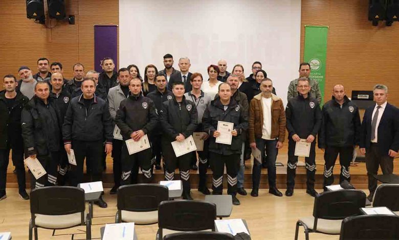 Eğitim ile ilgili Zabıta Dairesi Başkanlığı tarafından yapılan açıklamada, “Belediyemiz bünyesinde görev yapan özel güvelik görevlilerimiz, 6331 sayılı İş Sağlığı ve Güvenliği Kanunu kapsamında Temel İş Sağlığı ve Güvenliği eğitimi almıştır. 21-24 Kasım tarihleri arasında ilgili tüm personellerimize gerçekleştirilen eğitimlerde, fiziksel, kimyasal, biyolojik ve psikososyal risk etmenleri, tehlikeli durumlar, kişisel koruyucu donanımlar, Ekranlı çalışmalarda ergonomi, elle taşıma işleri, yangınla mücadele, acil durumlar, güvenlik ve sağlık işaretleri, ilk yardım, iş kazaları ve meslek hastalıkları gibi bir çok alanda eğitimler verilmiş ve eğitici videolarla süreç tamamlanmıştır. Akabinde gerçekleştirilen sınavı başarıyla tamamlayan personellerimize, sertifikaları takdim edilmiştir” ifadeleri kullanıldı.
