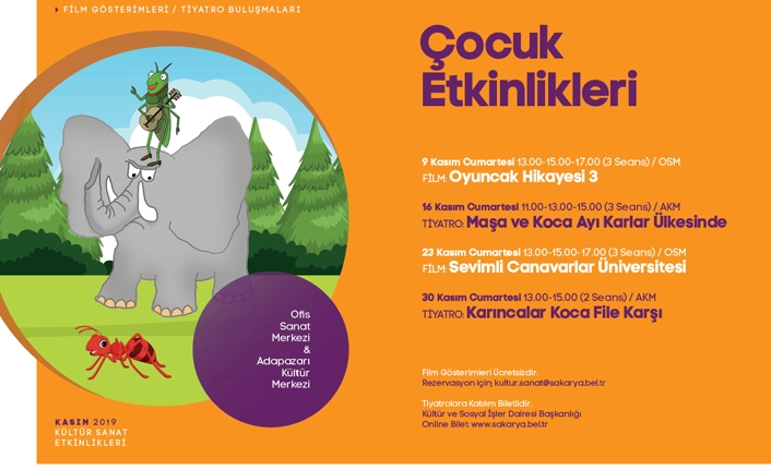 Açıklamanın devamında, “Kasım ayı Kültür Sanat Etkinliklerimiz kapsamında içerisinde çocuklara yönelik film gösterimlerinin ve tiyatro buluşmalarının yer aldığı çocuk etkinliklerine, 9 Kasım Cumartesi günü 3 seansta gerçekleştireceğimiz ‘Oyuncak Hikayesi 3’ filminin gösterimi ile başlıyoruz. 16 Kasım Cumartesi günü ise çocuk etkinliklerimize yine 3 seans olmak üzere AKM’de ‘Maşa ve Koca Ayı Karlar Ülkesinde’ adlı tiyatro oyunu ile devam edeceğiz. Vatandaşlarımız film gösterimlerine kultur.sanat@sakarya.bel.tr adresinden rezervasyon yaptırabilecekler. Tiyatro Buluşmalarına bilet almak isteyen vatandaşlarımız ise Kültür ve Sosyal İşler Dairesi Başkanlığı’ndan ya da www.sakarya.bel.tr adresinden online bilet alabilecek. Kasım ayı boyunca devam edecek çocuk etkinliklerimizin, Ofis Sanat Merkezi’nde gerçekleştireceğimiz film gösterimlerine ve AKM’de gerçekleştireceğimiz tiyatro buluşmalarına tüm çocuklarımızı davet ediyoruz” denildi.