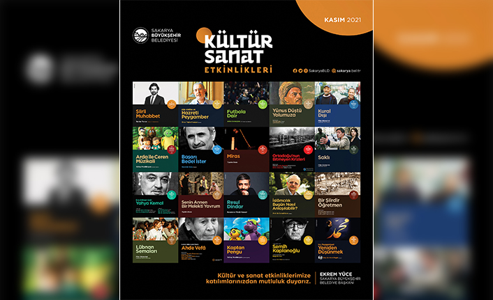 Sakarya Büyükşehir Belediyesi Kasım Kültür Sanat Etkinlikleri başlıyor. Söyleşi ve imza günlerinden konferanslara, sinema gösterimlerinden tiyatro gösterimlerine, panellerden konser ve dinletiler ile saygı gecelerine kadar birçok farklı etkinliğin kültür sanat dostlarıyla buluşacağı takvimin ilk konuğu ise Yazar ve TV Programcısı Serdar Tuncer olacak. Ömer Tuğrul İnançer, Prof. Dr. İsmail Kara, Mevlana İdris, Mustafa Tatçı, Leyla İpekçi, Nurullah Genç, Prof. Dr. Ahmet Uysal, Semih Kaplanoğlu gibi kültür sanat dünyasının yakından tanıdığı isimlerin yanı sıra Karadeniz müziğinin sevilen ismi Resul Dindar konseri de Kasım Kültür Sanat Etkinlikleri arasında yer alacak.