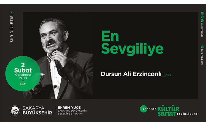 Sakarya Büyükşehir Belediyesi tarafından düzenlenen kültür etkinlikleri, Şubat ayında da dolu dolu devam ediyor. Şehirde ses getiren etkinliklere imza atan Büyükşehir Belediyesi, Dursun Ali Erzincanlı ile Şubat kültür sanat takvimini başlatıyor. 2 Şubat Çarşamba günü AKM’de ‘En Sevgiliye’ isimli şiir dinletisi ile kültür sanat dostlarıyla buluşacak olan Erzincanlı’nın programı saat 19.00’da başlayacak. Kültür ve Sosyal İşler Dairesi Başkanlığı’nca tüm kültür sanat dostları programa davet edildi.