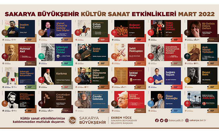Sakarya Büyükşehir Belediyesi tarafından her ay düzenli olarak gerçekleştirilen Kültür Sanat Etkinliklerinde Mart takvimi açıklandı. Söyleşi ve imza günlerinden konserlere, tiyatro gösterimlerinden panellere, sinema günlerinden konferanslara kadar birçok renkli etkinliği Sakaryalılar ile buluşturan programlarda Mart takvimi de yoğun programlara sahne olacak.