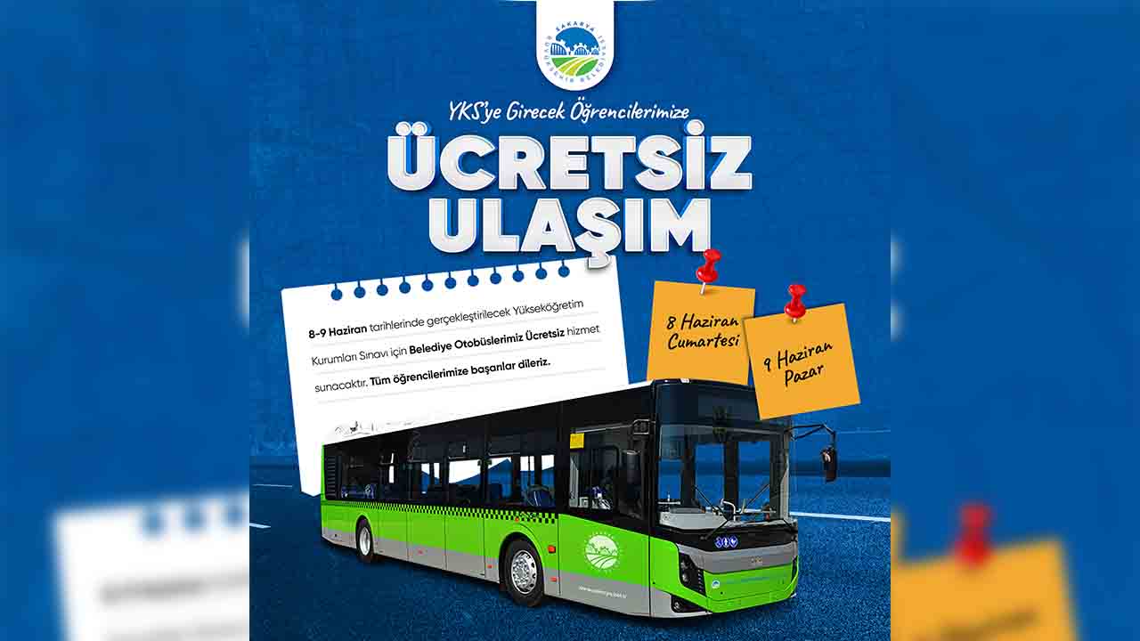 Sakarya Büyükşehir Belediyesi Ulaşım Daire Başkanlığı tarafından yapılan açıklamada, “8-9 Haziran tarihlerinde gerçekleştirilecek 2024 Yılı Yükseköğretim Kurumları Sınavı için (YKS) belediye otobüslerimiz ücretsiz ulaşım hizmeti sunacaktır. Öğrencilerimiz, sınav giriş belgesini göstererek ücretsiz ulaşımdan faydalanabilecek.
