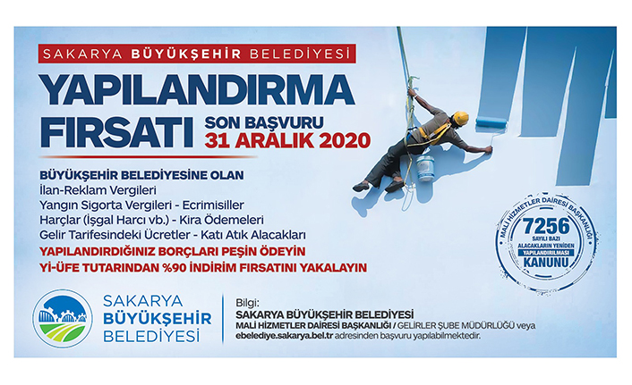 Sakarya Büyükşehir Belediyesi Mali Hizmetler Dairesi Başkanlığı Gelirler Şube Müdürlüğü tarafından, 11 Kasım Salı günü yürürlüğe giren 7256 Sayılı Bazı Alacakların Yeniden Yapılandırılmasına ilişkin kanun hakkında açıklama yapıldı. Vatandaşların yapılandırma kanunundan faydalanarak Büyükşehir Belediyesine olan birikmiş borçlarının kolaylıkla ödenebileceği, başvuruda bulunmak isteyen vatandaşların başvurularını 31 Aralık Perşembe gününe kadar Büyükşehir Belediyesi Gelirler Şube Müdürlüğüne şahsen veya posta aracılığıyla yapabilecekleri dile getirildi. Yapılandırma işlemlerinin Büyükşehir Belediyesi’nin resmi internet sayfası ebelediye.sakarya.bel.tr üzerinden de gerçekleştirilebileceği belirtildi.