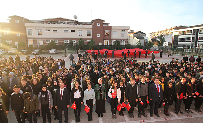 Sakarya Milli Eğitim Müdürü Fazilet Durmuş, 3 Şubat itibariyle 2. Dönemin başlangıcını yapıyoruz, bugün gençlerimizle birlikte. İlimizin tamamında bugün istiklal marşı törenimizde bayrak şiirimizi okuyarak başlıyoruz. Bilindiği gibi geçtiğimiz hafta Avrupa Parlamentosundan, bir Yunun Milletvekili Türk bayrağına bir saygısızlık yaparak bayrağımızı yırtmıştı, bizim ülkemizde gençlerimiz konu vatansa gerisinin teferruat olduğunu, bu vatanı kazanmak için niçe çocukların göz yaşı dökerek bu bayrağın bize emanet ettiği şuurunda olduğumuzu hissetsinler, ve bunu her daimde gönüllerinde yüreklerinde yaşatsınlar arzu ettik.