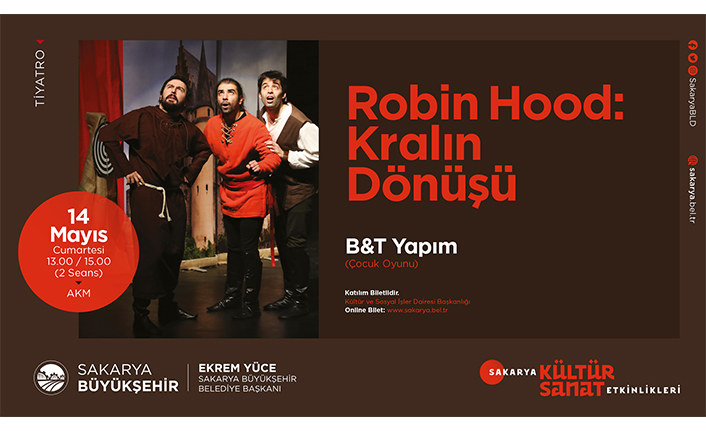 Birbirinden kıymetli isimler, dalında usta olan sanatçıları ağırlayan Büyükşehir, hafta sonu çocuklar ve aileler için harika bir hafta sonu aktivitesi olacak tiyatro oyununa ev sahipliği yapacak. B&T Yapım tiyatro ekibi tarafından ‘Robin Hood: Kralın Dönüşü’ isimli tiyatro gösterisi 14 Mayıs Cumartesi günü saat 13.00 ve 15.00 arasında AKM’de sahnelenecek.