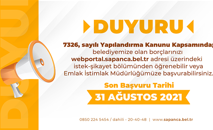 Sapanca Belediyesi Emlak ve İstimlak Müdürü Mustafa Bayraktar “Borçlarını yapılandırmak isteyen vatandaşlarımızın başvurularını almaya başlamış bulunmaktayız. Yapılandırma için son başvuru tarihi 31 Ağustos 2021’dir. Vergi borcu olanlara ödeme kolaylığı ve taksitlendirme imkânı sunan 7326 sayılı kanun vatandaşlarımıza birçok kolaylıklar getirmektedir. Yapılandırma ile birlikte vatandaşlarımızın vergi borcunda yeniden düzenleme yapılıyor. Ayrıca kanun, borçları taksitle ödeme kolaylığı da sağlıyor. Emlak, işyeri çevre temizlik, ilan-reklam vb. borcu olan vatandaşlarımızı bu fırsatı değerlendirmeye davet ediyoruz” dedi.