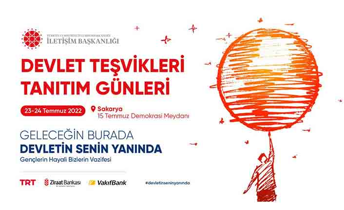 Sakarya Büyükşehir Belediyesi’nin ev sahipliği, Cumhurbaşkanlığı İletişim Başkanlığı koordinasyonunda organize edilen ‘Devlet Teşvikleri Tanıtım Günleri’ 23-24 Temmuz tarihlerinde 15 Temmuz Demokrasi Meydanı’nda gerçekleştirilecek. Bakanlıklar, Cumhurbaşkanlığı ofisleri ile Cumhurbaşkanlığına bağlı kuruluşların yer alacağı ve ‘Geleceğin Burada, Devletin Senin Yanında’ sloganıyla gerçekleştirilecek tanıtım günlerinde gençler burs, hibe, fon ve kredi gibi maddi destekler, ihtiyaç duydukları staj programları, uluslararası alandaki proje destekleri konularında bilgi sahibi olacak.