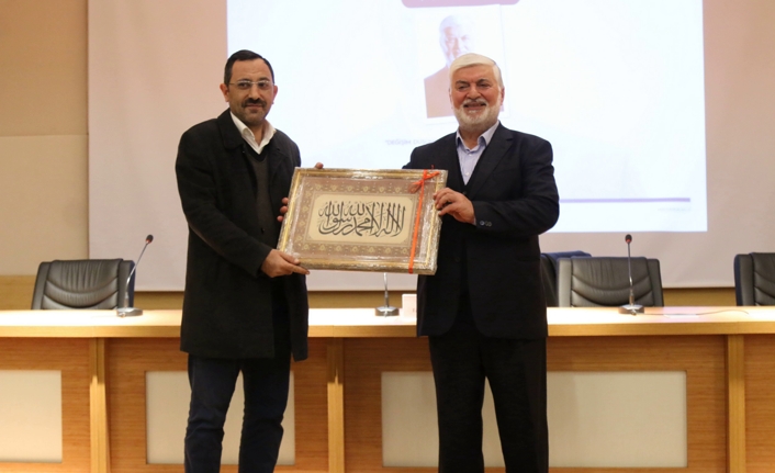 Konferansın ardından SAÜ İlahiyat Fakültesi Dekan Yardımcısı Prof. Dr. Osman Güman Prof. Dr. Faruk Beşer’e hediyelerini takdim etti.