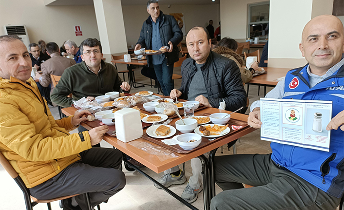 Yemekhaneye gelen personele üzerinde tuz kullanımına dikkat çekilen bardak sular ile broşürler dağıtıldı.