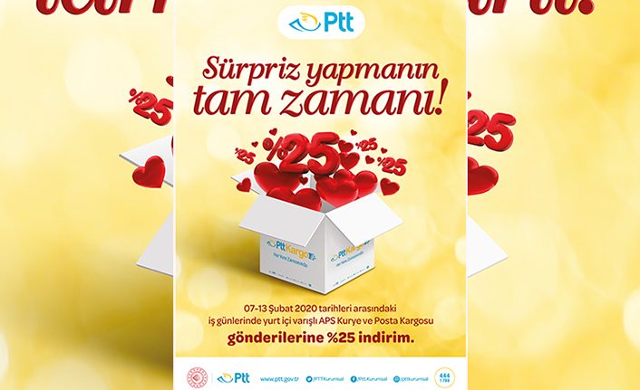 Türkiye’de posta, kargo, bankacılık, e-ticaret gibi birçok farklı alanda 180 yıldır kaliteli ve ulaşılabilir hizmet sunmayı amaçlayan Posta ve Telgraf Teşkilatı Anonim Şirketi (PTT AŞ), özel günlerde de müşterilerinin hayatını kolaylaştırmak adına çalışmalarını sürdürüyor. PTT, hazırladığı kampanya kapsamında Sevgililer Günü’ne özel 7 – 13 Şubat 2020 tarihleri arasındaki iş günlerinde yurt içi varışlı APS Kurye ve posta kargosu gönderilerine yüzde 25 indirim uygulayacak.