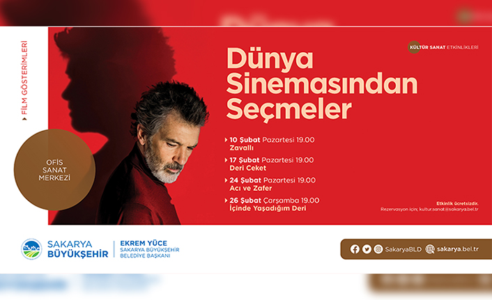 Sakarya Büyükşehir Belediyesi Şubat Kültür Sanat Etkinlikleri kapsamında dünya sinemasından seçme film gösterimleri sinemaseverlerle buluşacak. 10 Şubat Pazartesi günü ‘Zavallı’ isimli film ile gerçekleştirilecek ilk gösterim Ofis Sanat Merkezi’nde saat 19.00’da başlayacak. Film gösterimlerine katılmak isteyen sinemaseverler kultur.sanat@sakarya.bel.tr adresine mail atarak yerlerini ayırtabilecek. Konuyla ilgili yapılan açıklamada, “Dünya sinemasından seçme film gösterimlerine tüm hemşehrilerimiz davetlidir” denildi.