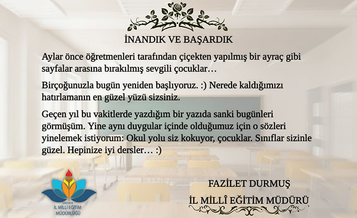 İl Millî Eğitim Müdürü Fazilet Durmuş Pazartesi mesajında şu ifadelere yer verdi.