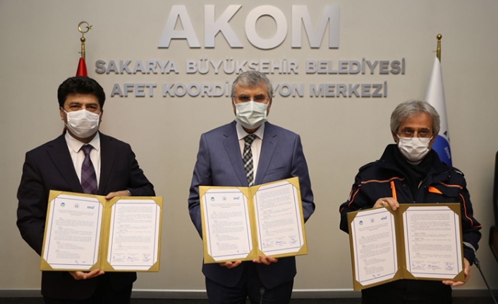 Sakarya Büyükşehir Belediyesi, Sakarya İl Afet ve Acil Durum Müdürlüğü (AFAD) ve Sakarya Uygulamalı Bilimler Üniversitesi (SUBÜ) arasında afet anlarında bilinçle hareket edebilecek gençlerin yetiştirilmesi için iş birliği protokolü imzalandı. Afet Koordinasyon Merkezi’nde düzenlenen protokol törenine Büyükşehir Belediye Başkanı Ekrem Yüce’nin yanı sıra SUBÜ Rektörü Prof. Dr. Mehmet Sarıbıyık ve AFAD Sakarya İl Müdürü Hüseyin Kaşkaş da katıldı. İmzalanan protokol kapsamında Büyükşehir Belediyesi itfaiyesine bağlı uzman itfaiye erleri ve AFAD ekipleri SUBÜ Denizcilik Meslek Yüksek Okulu’nda eğitim gören öğrencilere afet durumlarına hazırlıklı olmaları için gerekli eğitimleri verecek. Afetlere karşı bilinçli bir neslin yetiştirilmesi için imzalanan protokolün hayırlı olmasını dileyen Başkan Yüce, gençlerin eğitimine katkı sağlayacak çalışmalara destek olmaya devam edeceklerini vurguladı.