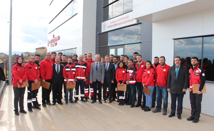 Yurdun dört bir yanından olduğu gibi ilimizden de 4 araçla Elazığ’a giden 20 kişilik ekibin başarısını takdir ettiğini dile getiren Öğütlü “Depremin hemen ardından 17 UMKE ve 3’ü 112 personeli olmak üzere 20 kişilik ekibimiz Elazığ’a giderek 5 gün boyunca çalışmalara katıldı. Buradaki çalışmalarda gösterdiğiniz gayret için hepinize ayrı ayrı teşekkür ediyorum. Böyle acıları Cenabı Allah bir daha bizlere yaşatmasın.” dedi. İdarecilerinde hazır bulunduğu törende ekip üyelerine yaptıkları çalışmalar dolayısıyla teşekkür belgesi verildi.