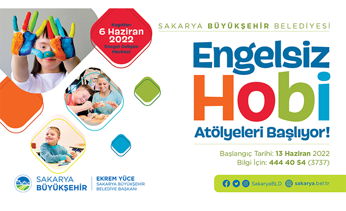 Sakarya Büyükşehir Belediyesi Sosyal Gelişim Merkezi’nde Engelsiz Hobi Atölyeleri başlıyor. Pandemi dolayısıyla ara verilen engelsiz atölyeler için kayıtlar 6 Haziran Pazartesi günü başlayacak. Kursiyerler aileleri ile birlikte Sosyal Gelişim Merkezi’nde kayıtlarını yaptırabilecek.