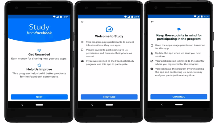 Facebook’un yeni uygulaması Study; bir kullanıcının telefonuna hangi uygulamaları yüklediğini, bu uygulamaları kullanarak harcadığı süreyi, ilgili kişinin bulunduğu ülkeyi ve buna benzer bilgileri öğrenecek. Buna ek olarak bu yazılım, bireylerin kullandığı telefon veya uygulama özellikleri hakkındaki bilgileri de kullanıcılardan talep edecek.