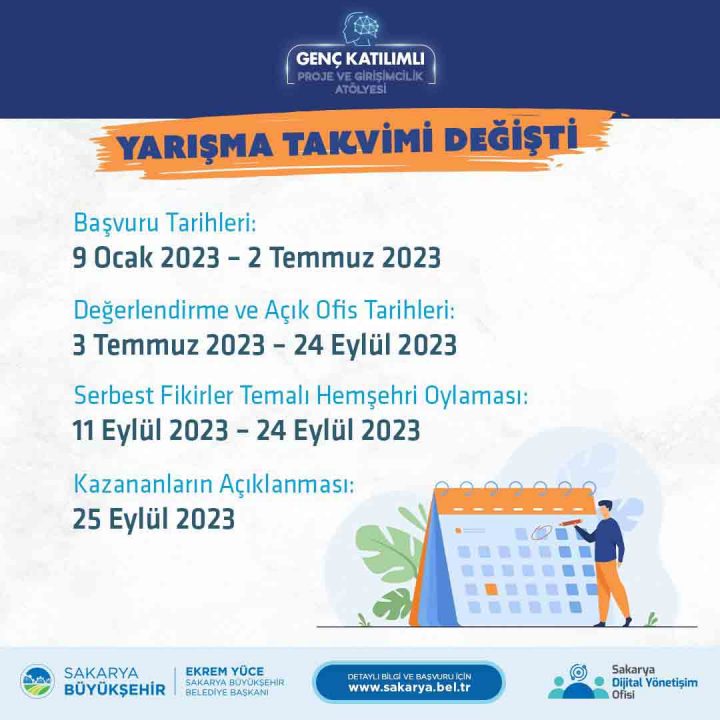 Sakarya Büyükşehir Belediyesi, şehrin geleceğine yön vermek için üretmeye, geliştirmeye ve kazandırmaya devam ediyor. Gençlik projelerine ağırlık veren Büyükşehir, geleceğin Sakarya’sını genç fikirlerle hazırlıyor. Strateji Geliştirme Dairesi Başkanlığı tarafından düzenlenen ödüllü Genç Katılımlı Proje ve Girişimcilik Atölyesi Fikir Yarışması’na başvurular 2 Temmuz Pazar gününe kadar uzatıldı. Yarışma hakkında detaylara ve başvuru rehberine sakarya.bel.tr adresinden ulaşılabiliyor.