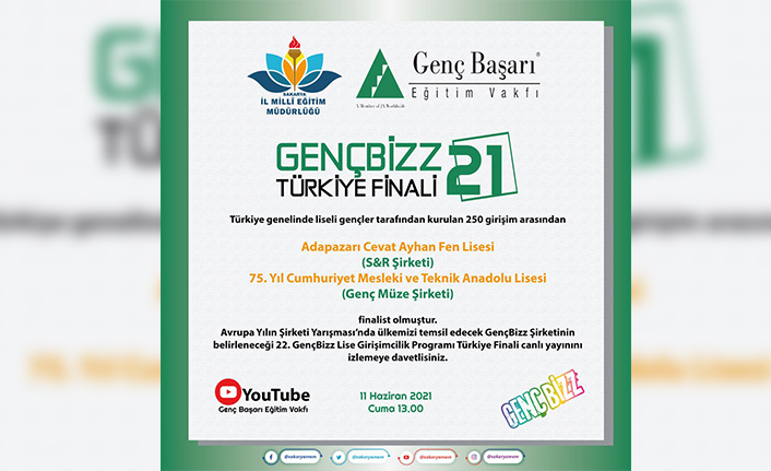 22. GençBizz Lise Girişimcilik Programı’nda, 250 girişim arasından Avrupa Yılın Şirketi Yarışması’nda ülkemizi temsil edecek GençBizz şirketinin belirleneceği Türkiye finali 11 Haziran 2021 Cuma günü Genç Başarı Eğitim Vakfı YouTube kanalında canlı yayımlanacak.
