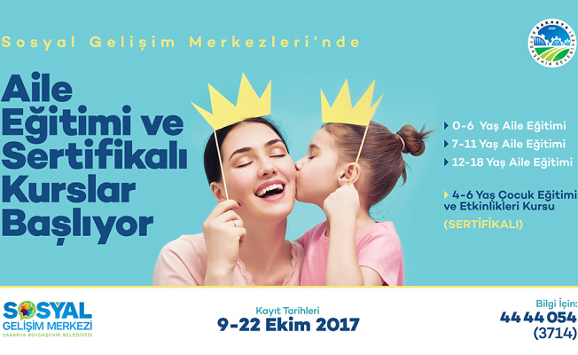 Sakarya Büyükşehir Belediyesi Sosyal Hizmetler Dairesi Başkanlığı tarafından düzelenen Aile Eğitimi ve Sertifikalı kurslar başlıyor. Sosyal Gelişim Merkezlerinde gerçekleştirilecek eğitimler için kayıtların 9 Ekim Pazartesi günü başlayacağını açıklayan Sosyal Hizmetler Dairesi Başkanı Davut Yüce, kayıtların 22 Ekim Pazar günü sona ereceğini açıkladı. Yüce, “Aile bireylerinin anne, baba ve eş olma rollerinin sorumluluğunu almalarını ve doğru yaklaşımlar ile aile bağlarının güçlenmesine katkı sağlamaları amacıyla düzenlenen kurslarımız, 23 Ekim Pazartesi günü başlayacak. Topluma sağlıklı bireyler kazandırmak, çocuk ve aile ilişkilerindeki değerlerin farkına varmak için düzenlediğimiz kurslarımıza tüm halkımız davetlidir” dedi. kocaali kocaali haber