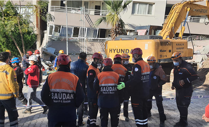 Hasar gören ve yıkılan binalarda yapılacak arama kurtarma çalışmalarına katılmak üzere depremin hemen ardından Sakarya’dan yola çıkarak İzmir’e ulaşan SAÜDAK ekibi, burada çalışmalara başladı.