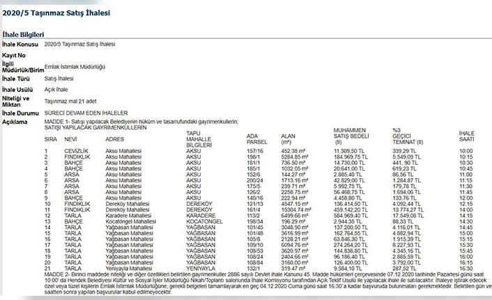 İhaleyle ilgili yapılan açıklamada, “İhaleye iştirak edecek özel veya tüzel kişilerin Emlak İstimlak Müdürlüğüne; gerekli belgeleri tamamlayarak en geç 04.12.2020 Cuma günü saat 16:30`a kadar başvuruda bulunmaları gerekmektedir. Belirtilen gün ve saatten sonra yapılan başvurular kabul edilmeyecektir. İstekli olmaması durumunda ihaleler katılımcı olmadığı için yapılmamakta ve yeniden ihaleye çıkmak kaydıyla ileri tarihe ertelenmektedir.