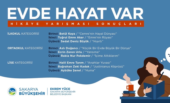 Sakarya Büyükşehir Belediyesi Kültür ve Sosyal İşler Dairesi Başkanlığı’nın karantina sürecini fırsata çevirmek için düzenlediği “Evde Hayat Var!” hikâye yarışmasının kazananları belli oldu. 13 Nisan’da başlayan ve 6 Mayıs Çarşamba günü başvuruların sona erdiği yarışmada yaklaşık 600 hikâye kaleme alınırken, dereceye giren hikâyeler Sakarya Büyükşehir Belediyesi’nin internet sayfasında ilan edildi.