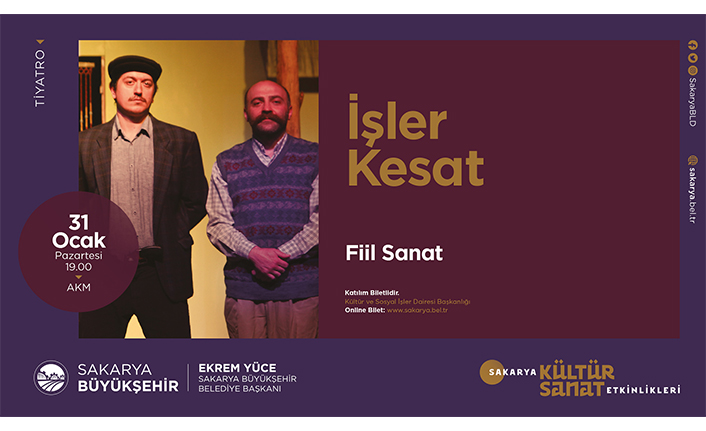Sakarya Büyükşehir Belediyesi Kültür ve Sosyal İşler Dairesi Başkanlığı tarafından her ay düzenlenen kültür sanat programları usta oyuncuların yer aldığı bir tiyatro oyununu daha izleyiciyle buluşturuyor. 31 Ocak Pazartesi günü ‘İşler Kesat’ isimli tiyatro oyunu, AKM’de saat 19.00’da sahne alacak. Fiil Sanat tarafından sanatseverler ile buluşacak oyuna katılım biletlidir. Kültür Dairesinden yapılan açıklamada, “ Katılım için izleyicilerimiz www.sakarya.bel.tr adresinden çevrimiçi olarak biletlere ulaşabilirler. Her ay alanında usta isimleri sanatseverlerle buluşturmaya devam ediyoruz. Kültürün ve sanatın bir arada olduğu programlarımızla izleyicilerimizi buluşturmaya devam edeceğiz” denildi.