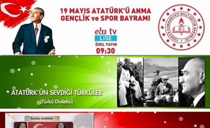 TRT EBA TV Lise ekranlarında 19 Mayıs salı günü saat 09.30 da başlayacak bayram özel yayınında; Atatürk’ün Sevdiği Türküler, Dünya Ülkelerinden 19 Mayıs Kutlama Mesajları, Şiir Dinletisi ve Tarih Söyleşileri, Milli Sporcularımızdan 19 Mayıs Mesajları, ‘Biri Geliyor’ isimli Tiyatro Oyunu, Türk Cumhuriyetlerinden Kutlama Mesajları, ‘Sizden Gelenler’ bölümünde Ülkemizin Farklı İllerinden Etkinlik Videoları, E- Kitapta Lise Öğrencileri Arası Oryantiring Müsabakası, Samsun’dan Erzurum’a Canlı Performans Resim Yapımı, 19 Mayıs Doğumlu Öğrencilerimizin Mesajları, ‘Mustafa Kemal Samsun’da Bugün’ Rap Şarkısı, Öğretmenler Korosu’ndan Gençlik Marşı, Kahramanlık Türküleri, 1930’lardan Günümüze 19 Mayıs Kutlamalarından Nostaljik Görüntüler, ‘Tek Yürekte Vatan’ başlıklı Ülkemizin Uç Noktalarından Mesajlar, Liseliler Arası Çevrimiçi Bilgi Yarışması programları yayınlanacak.