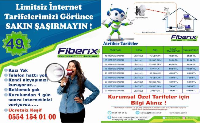 Çok kısa sürede bir çok abone sayısına ulaşan FİBERİX internet siz Karasulu ve Kocaali’lerin hizmetinde. FİBERİX Firması hizmetlerinden mennum olmayan abonelerin 15 gün içersinde geri iade etmeyi taahhüt ediyor.