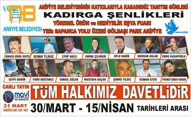Arifiye Belediyesi’nin katkılarıyla Karadeniz Tanıtım Günleri adıyla 23 Mart – 1 Nisan tarihleri arasında düzenlenmesi planlanan “Yöresel Ürün ve Hediyelik Eşya Fuarı”; “Kadırga Şenlikleri” adıyla 30 Mart – 15 Nisan tarihleri arasına ertelendi. 17 gün boyunca Sapanca yolu üzeri Gölbaşı Park’ta gerçekleşecek olan Şenlik Programı 31 Mart Cumartesi günü, 13.00-16.00 saatleri arasından da Mavi Karadeniz TV’de canlı olarak yayınlanacak. “Karadeniz Tanıtım Günleri”nde; Karadeniz Sanatçıları Adnan Yılmaz, Eyüp Nazlı, Emine Çilingir, Oflu Kadir, Burhan Arslan, Ebru Kasapoğlu, Seyfi Demir, Fikri Bostancı, İsmail Güler, Mustafa Kaçar ve Şükrü Yıldız sahne alacak. Gönül Dostu’nun sunuculuğunu üstlendiği programda Kemençe’de Osman İlter ve Klavyede’de Ender Vardar eşlik edecek. Fuar Organizatörü Eyüp Nazlı ve Organizatör Müdürü Erkan Demir öncelikle ellerinde olmayan şartlarla fuarın ertelenmesinden dolayı üzüntülerini belirterek, Sapanca yolu üzeri Gölbaşı Park’ta göl kenarında 17 gün boyunca sürecek olan fuara, tüm Sakarya halkını beklediklerini söyledi.