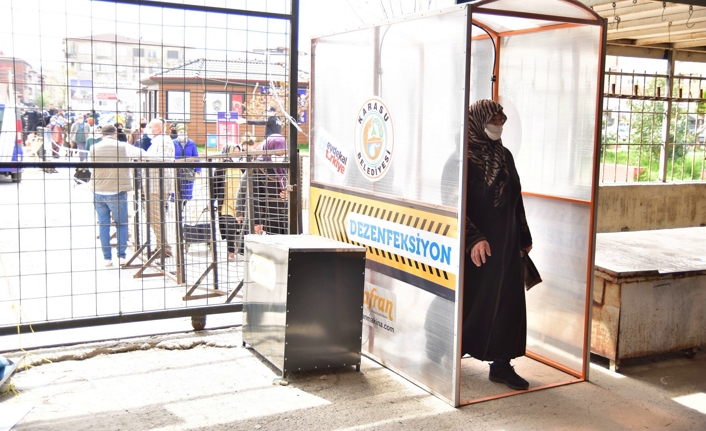Karasu Belediyesi tarafından yeni tip Korona virüs (Kovid-19) tedbirleri kapsamında, pazar yeri girişine dezenfektan kabini yerleştirildi. Sosyal mesafe kurallarına riayet edilerek kabine alınan vatandaşlara, zabıta ekiplerince de maske dağıtılıp ateş ölçümleri yapıldı.