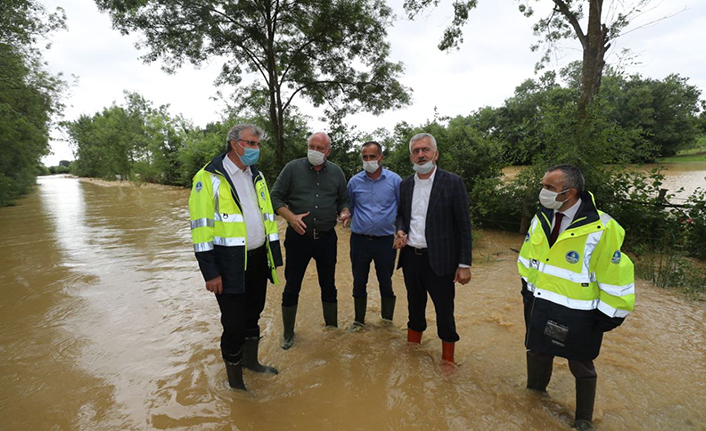 Sakarya Büyükşehir Belediye Başkanı Ekrem Yüce, Sakarya Valisi Çetin Oktay Kaldırım’la birlikte sağanak yağışların ardından Kaynarca’da sel ve su taşkınlarının yaşandığı bölgelerde incelemelerde bulundu. Şehrin özellikle kuzey bölgesinde etkisini gösteren yağışla birlikte Kaynarca’da metrekareye 72 kilogram yağış düştüğü bildirildi. Sabahın ilk saatlerinden itibaren yoğun bir mesai harcayarak taşkınlara müdahale eden SASKİ ekipleri marifetiyle sel nedeniyle kapanan köy yolları temizlenirken, bahçelerinde su taşkını meydana gelen vatandaşların da bahçelerinden su vidanjör araçlarının yardımıyla çekildi. Kaynarca Belediye Başkanı Murat Kefli, Vali Kaldırım ve Başkan Yüce’ye son duruma ilişkin bilgiler verdi.
