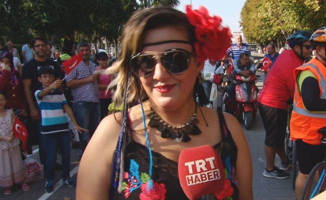 Süslü kadınlar değişik kıyafetlerle çocuklarıyla bisiklet turu yaparken, çok mutlu olduklarını eşleriyle ve çocuklarıyla süslü kadınlar bisikler gezisine katıldıklarını söylediler.