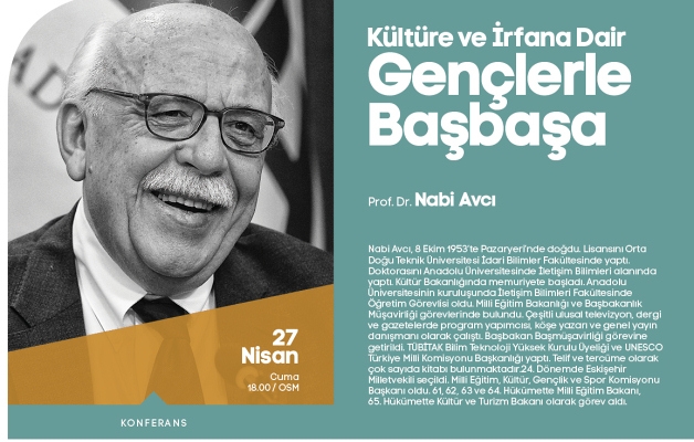 Sakarya Büyükşehir Belediyesi Nisan Kültür Sanat Etkinlikleri, 27 Nisan Cuma günü gerçekleştirilecek ‘Kültüre ve İrfana Dair Gençlerle Başbaşa’ isimli konferans ile devam edecek. Ofis Sanat Merkezi’nde saat 18.00’da gerçekleştirilecek olan programa Prof. Dr. Nabi Avcı konuşmacı olarak katılacak. Kültür ve Sosyal İşler Dairesi Başkanlığı’ndan yapılan açıklamada, “Prof. Dr. Nabi Avcı’nın katılacağı ‘Kültüre ve İrfana Dair Gençlerle Başbaşa’ konulu konferansımıza tüm kültür sanat dostları davetlidir” ifadelerine yer verildi.