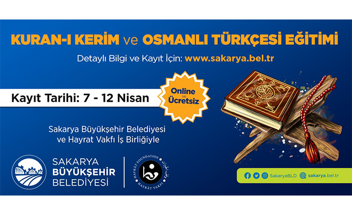Sakarya Büyükşehir Belediyesi Kültür ve Sosyal İşler Dairesi Başkanlığı ve Hayrat Vakfı iş birliğiyle düzenlenecek Kuran’ı Kerim ve Osmanlı Türkçesi eğitimleri için kayıtlar başladı. Yaygın Eğitim Şube Müdürlüğünün koordinasyonunda gerçekleştirilecek olan ücretsiz eğitimler çevrimiçi yapılacak. Konuyla ilgili yapılan açıklamada, “Kur’an-ı Kerim ve Osmanlı Türkçesi eğitimlerimiz 2 kurdan oluşacaktır. Haftada iki gün belirlenmiş saatlerde yapılacak eğitimler alanında uzman isimler tarafından gerçekleştirilecektir. 12 Nisan’da sona erecek kayıtların tamamlanmasının ardından katılımcılarımıza ilişkin gerekli bilgilendirmeler yapılacaktır. Detaylı bilgi için www.sakarya.bel.tr adresi ziyaret edilebilir” denildi.