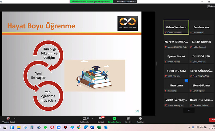 SATSO Akademi platformu üzerinden online olarak Eğitmen Özlem Yurdanur’un sunumuyla gerçekleştirilen eğitimde kurumsal eğitim ve gelişim, öğrenen organizasyon, yaratıcılık, süreklilik ve sürdürebilirlik, eğitim ortamları yaratmak sosyoekonomik anlamda birçok önemli bilgi SATSO üyeleriyle paylaşıldı.